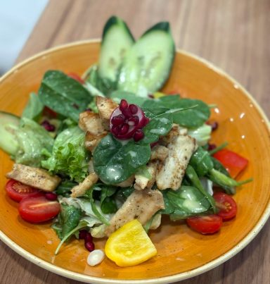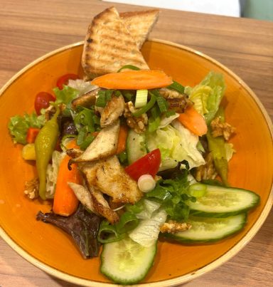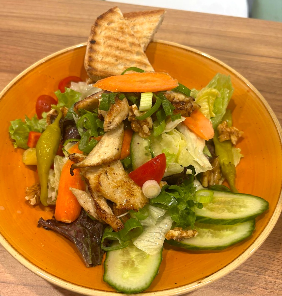 Grüner Salat, Hähnchenstreifen, Gurken, Tomaten, Zwiebel, Paprika, Walnüsse & Vinaigrette